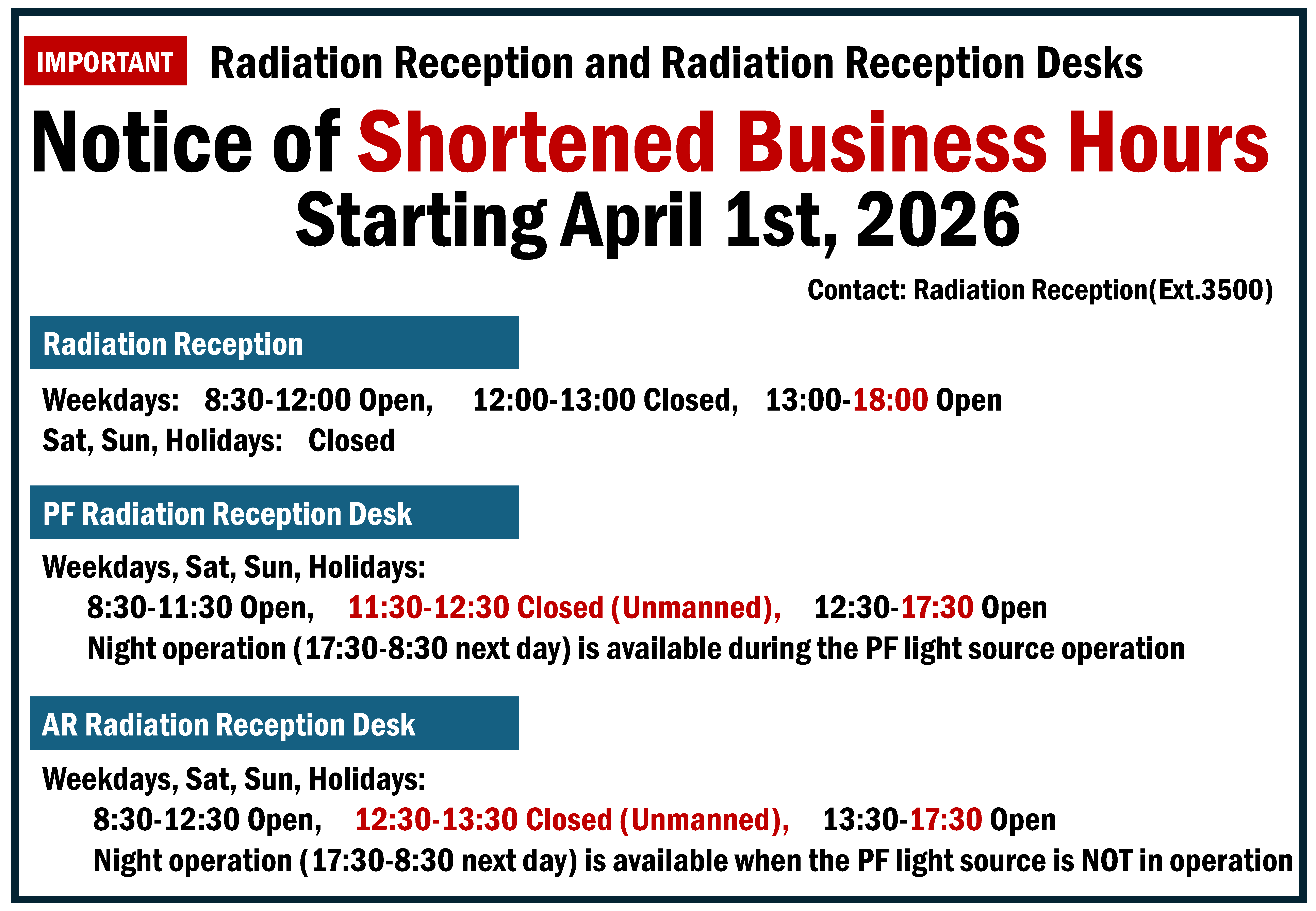 Notice of Shortened Business Hours for Radiation Reception and Desks (2026.01.29) [English]