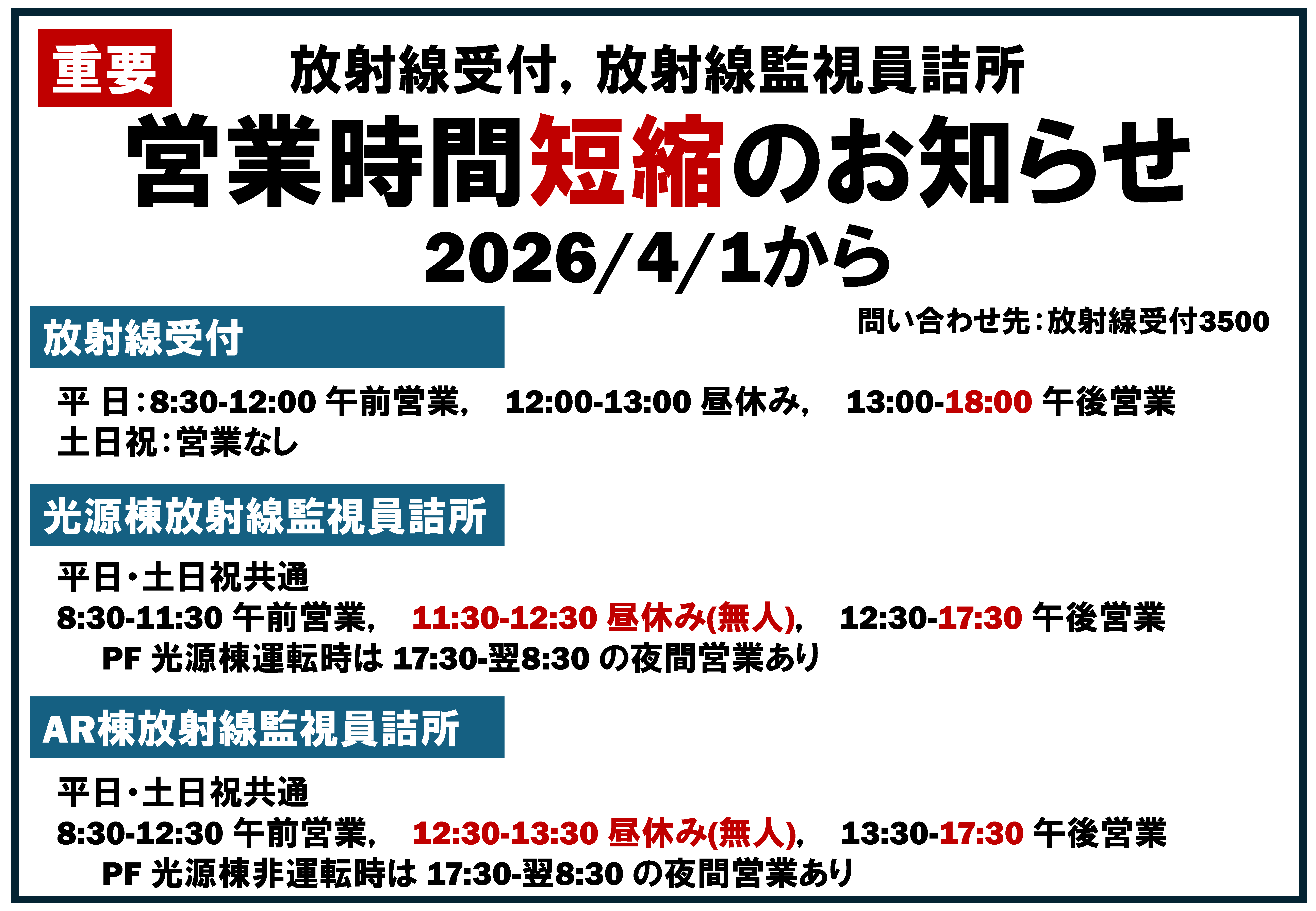 放射線受付,放射線監視員詰所の営業時間短縮のお知らせ (2026.01.29)[日本語]